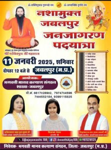 गुरुजी,…. प. पु.स्वामी श्री शक्ति पुत्र जी के आशीर्वाद से एवं श्री अजय अवस्थी के मार्गदर्शन/ नेतृव में मध्य प्रदेश जबलपुरमे /11,1,2025 इस यात्रा मे हजारों की संख्या मे लोग शामिल हुए थे मुंबई में बढ़ती नशाखोरी के जनजागृति के लिएअइसी यात्रा मुंबई मे निकली जाएगी ऐसा मुंबई के पूर्व उपमहापौर बाबूभाई भवानजी ने कहा है इसकी तैयारी हो रही है