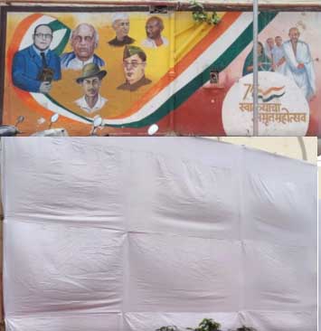 मनपा मुख्यलाय परिसर में हुए ध्वजारोहण स्थान के दीवारों पर महापुरुषों के चित्र पर लगाया गया पर्दा!