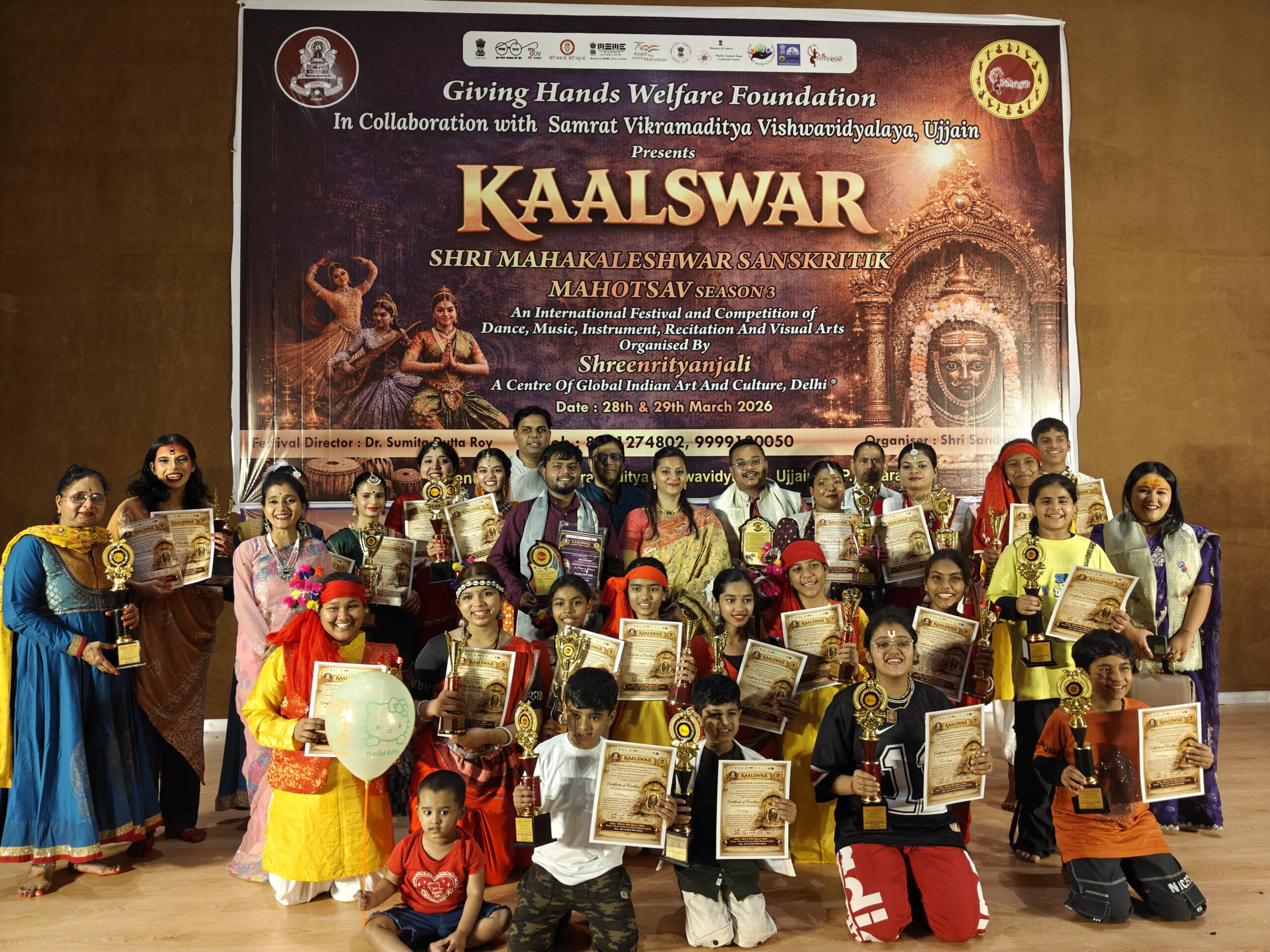 बिलासपुर,छत्तीसगढ़। ए सेंटर ऑफ ग्लोबल इंडियन आर्ट एंड कल्चर तथा श्री नृत्यांजलि संस्था द्वारा उज्जैन में आयोजित “महाकालेश्वर सांस्कृतिक महोत्सव 2026” में बिलासपुर के राग मंच संगीत विद्यालय के छात्र-छात्राओं ने उत्कृष्ट प्रदर्शन करते हुए कई प्रथम स्थान हासिल कर शहर का नाम रोशन किया।